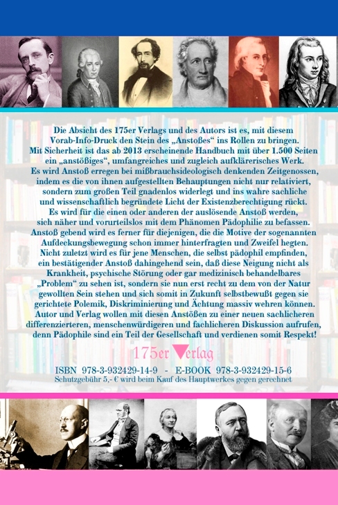 Weiter werden die verschiedenen, pädophil motivierten Kontakt- und Beziehungsformen (sowohl sexuelle wie nicht-sexuelle) zu Kindern dargestellt und wie diese sich von nicht-pädophilen Kontakten unterscheiden. Nicht ausgeklammert bleiben mögliches Fehlverhalten gegenüber Kindern und sexuelle Übergriffe. Erwähnung findet das in vielen Fachbüchern beschriebene Sexualverhalten von Kindern, wobei in diesem Zusammenhang die Andersartigkeit der kindlichen Sexualität gegenüber der von Erwachsenen hervorgehoben wird. Die möglichen schädigenden Folgen pädosexueller Kontakte werden nicht verschwiegen, gleichzeitig aber auch das mißbrauchsideologische Paradigma, das solche Schäden prinzipiell unterstellt, als unhaltbar zurückgewiesen. Ein Thema, das sich durch alle Kapitel zieht, ist die gesellschaftliche Ausgrenzung pädophil empfindender Menschen. Zum Schluß werden die bestehenden strafgesetzlichen Regelungen hinsichtlich ihrer Zielsetzung und ihrer Zweckerfüllung einer kritischen Prüfung unterzogen.